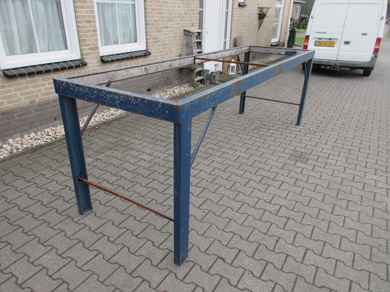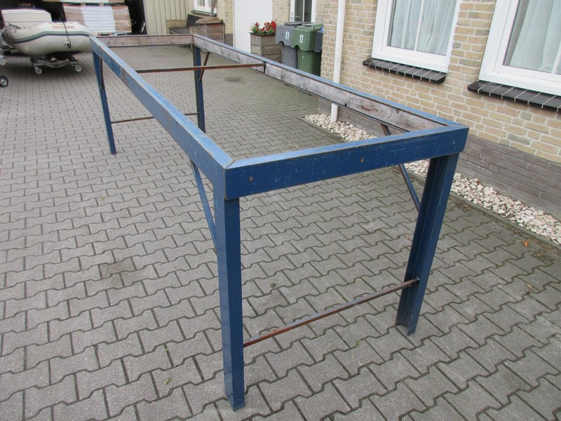 Zware degelijke bok voor de stalling van outboardmotoren. Rondom kunnen ongeveer 20 motoren hangen (voorraadbok) Lengte 3,40 meter. Breedte 1 meter. Hoogte 1,10 meter. Prijs € 250,-