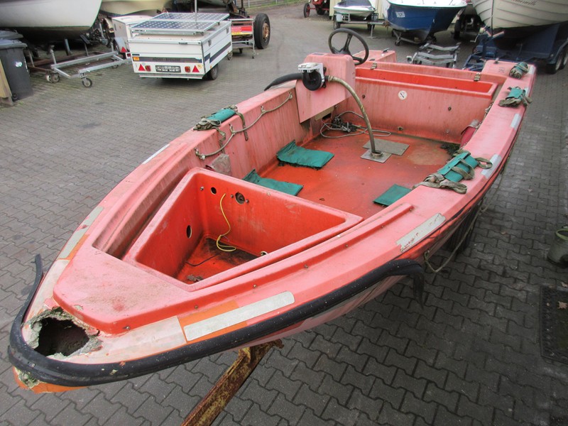 Polyester reddingsboot Het betreft een boot met werk; o.a. polyesterschade (zie foto's) Zeer degelijk en sportief gebouwd Merk Viking Type 470 GRP1 Lengte 4,75 meter Breedte 1,90 meter 6 persoons Zelflozend Vraagprijs € 1200,-