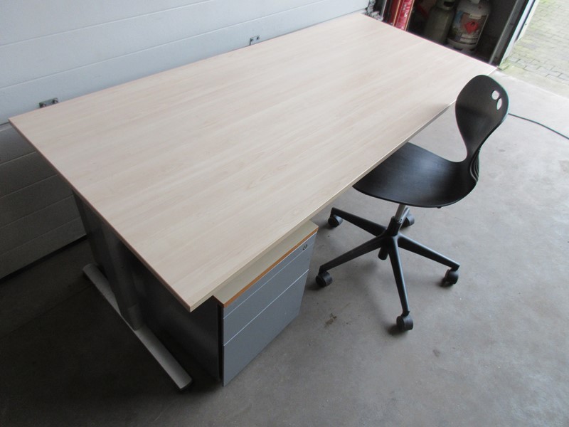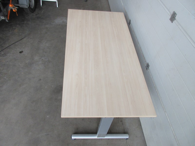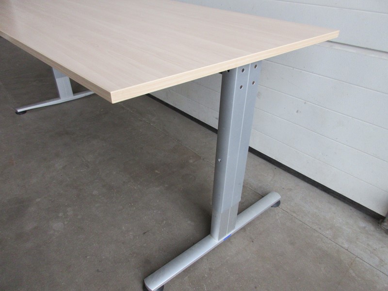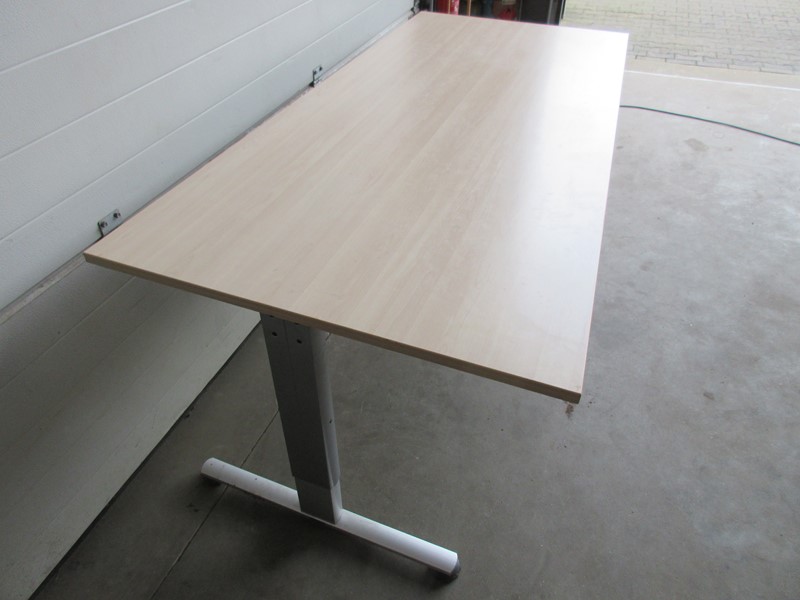 Buro, tafel. Merk Marko. Lengte 180 cm. Breedte/diepte verloopt van 80 naar 90 cm. Hoogte is instelbaar. Staat nu afgesteld op 75 cm. Prijs € 75,-