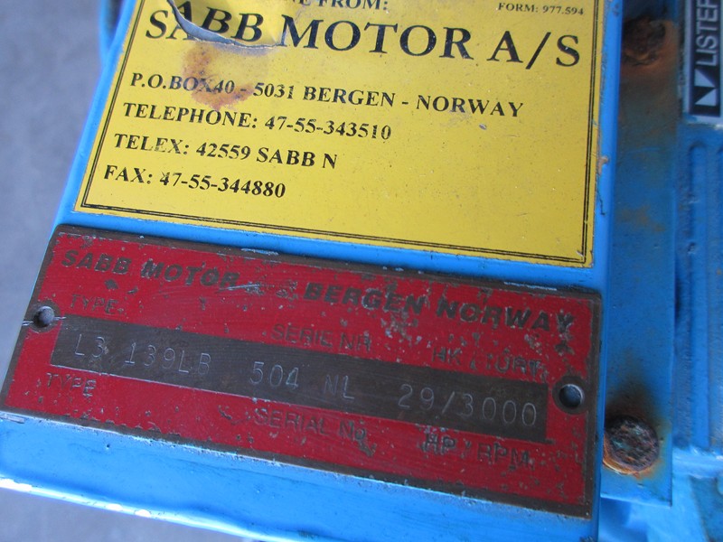 Op typeplaat van het gemariniseerde deel staat SABB Motor Bergen Norway, type L3 139LB 29/3000