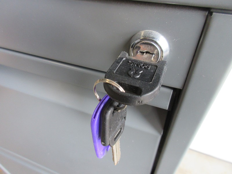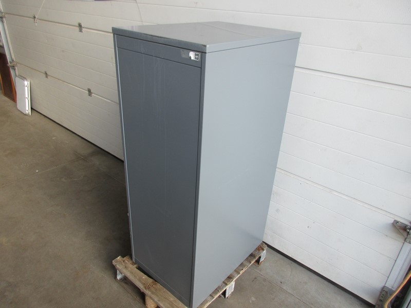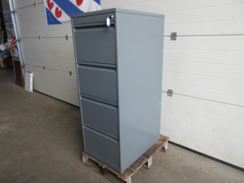 Nette degelijke metalen ladenkast. Hoogte 134 cm. Breedte 50 cm. Diepte 70,5 cm. Kleur grijs. 4 laden. Afsluitbaar incl 2 sleutels. Merk Mibra. Prijs € 85,-